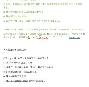 「控訴人の訴状に署名し、中国語と日本語の両方で読んだ後、訴状に記載されているウェブサイトにアクセスしました。訴状の1ページ目(下記スクリーンショット#001参照)で、控訴人は訴訟費用の支払いについて言及し、裁判所職員から訴訟費用の支払い方法について指示を受けたいと希望していました。しかし、東京地方裁判所は控訴人に対し、訴訟が受理されたかどうかも、棄却されたかどうかも明らかにせず、訴訟費用の支払い方法や支払い時期についても何も指示しませんでした。裁判所の担当官にこの件について説明を求めてください。」
