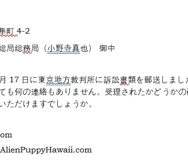 我不仅仅是上诉人, 原告方, 而且是日本的纳税人. 所有有关的日本政府的工作人员, 包括在北京的日本大使, 领事部负责人, 外务省的监察部门和东京地方法院有义务对我的质询与要求进行反馈. 但是他们并没有做任何工作. 这是渎职犯罪与欺诈纳税人的犯罪.